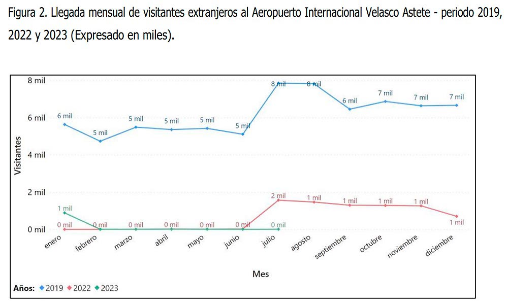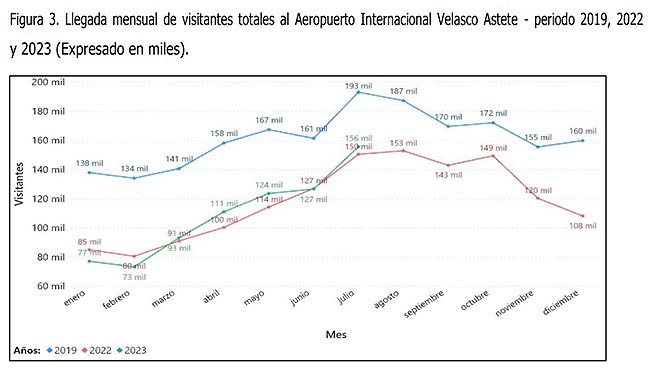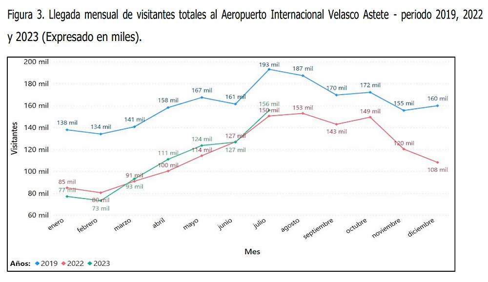 Durante el periodo enero – julio de 2023, arribaron 760,033 pasajeros al aeropuerto Alejandro Velasco Astete. Si se observa las cifras de manera más detallada, se identifica que la cantidad de pasajeros que arribó a la región Cusco en este periodo ha disminuido un 30.43% respecto al 2019 (niveles prepandemia) y, aunque muestra un ligero incremento respecto al mismo periodo en 2022, el análisis mes a mes muestra el impacto de la convulsión social.
