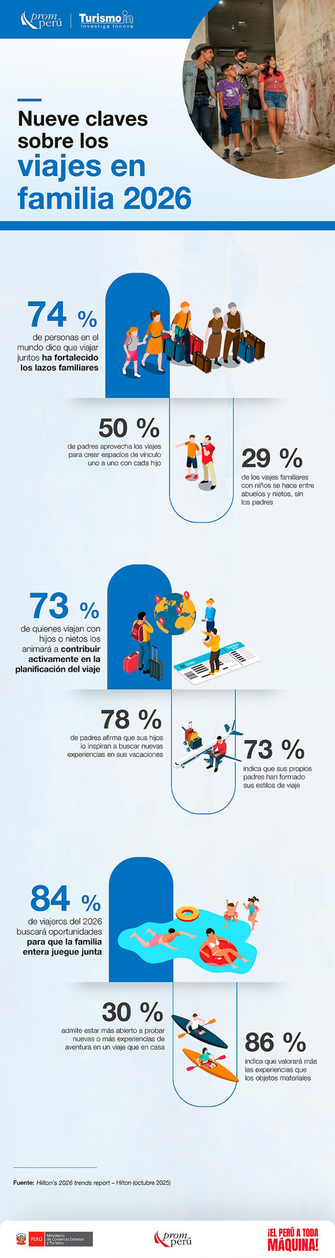 “Esta doble dimensión —económica y relacional— explica por qué los viajes en familia crecen en volumen a la par que en complejidad: travesías multigeneracionales, intergeneracionales, experiencias personalizadas por edades y motivaciones. Para los operadores turísticos, estas dinámicas no son solo oportunidades comerciales, sino también una vía para crear productos con mayor valor percibido, generar fidelidad temprana y conexión duradera”, señala PromPerú.