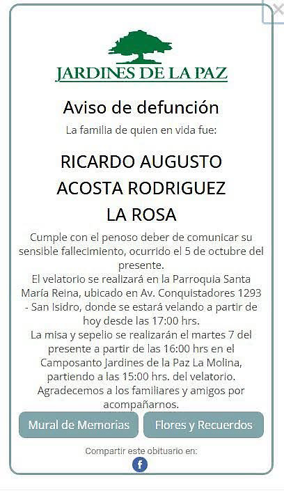 La misa y sepelio tendrán lugar mañana martes 7 de octubre a partir de las 4 p.m. en el Camposanto Jardines de la Paz La Molina, partiendo a las 3 p.m. del velatorio.