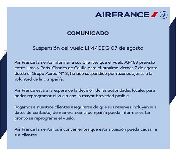 Por lo tanto, indicó que el vuelo de Air France en la ruta Lima – París, que estaba programado para el 7 de agosto, y el vuelo de KLM entre Lima y Ámsterdam, programado para el 6 de agosto, están suspendidos y tendrán que reprogramarse.